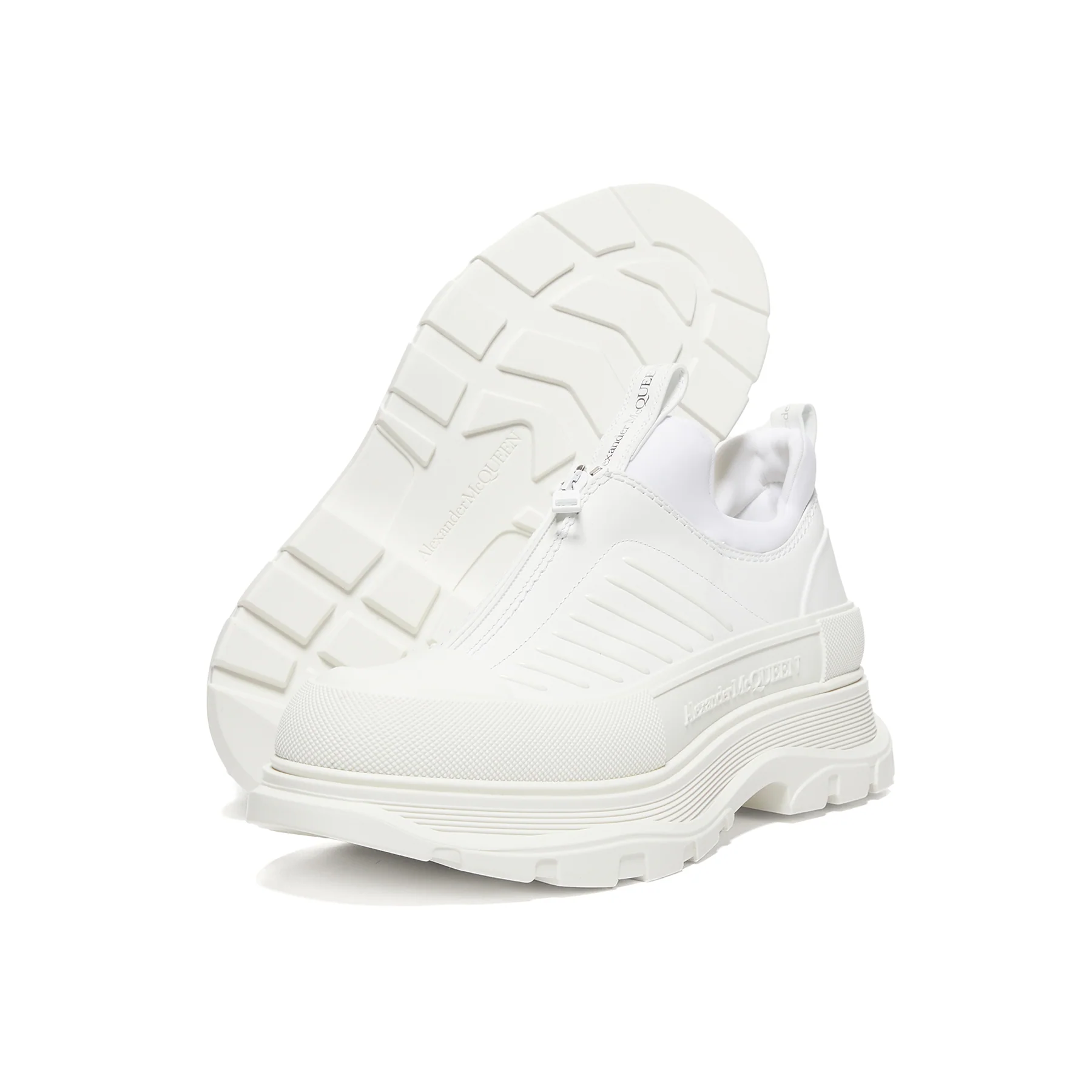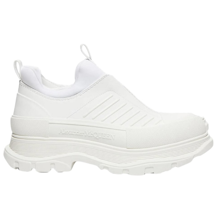 The Alexander McQueen Tread Slick Zip Up in ‘White’ embodies a fusion of high fashion and streetwear culture. Known for pushing boundaries, McQueen’s design philosophy shines through in this sneaker, which effortlessly marries elegance with an edgy vibe. Originally crafted for those who dare to stand out, this sneaker has become a staple for both the runway and the urban landscape. Crafted from premium leather, the upper features a sleek silhouette with subtle paneling that adds depth without overwhelming the minimalist aesthetic. The zip closure not only enhances the modern look but also provides practicality, making it easy to slip on and off. The cushioned outsole is designed for durability and traction, ensuring that you can navigate various terrains with confidence