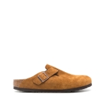 The Mink colorway of the Birkenstock Boston in Suede with a Soft Footbed is a slide-on shoe that features an upper of rich, coppery-brown suede. A midfoot strap threads through a slot at the arch of the foot and fastens at a coppery buckle on the lateral side. The insole is natural brown suede with an underlining of foam designed to provide customized support with wear. Birkenstock branding is debossed on the inner mud guard and stamped in blue on the insole.