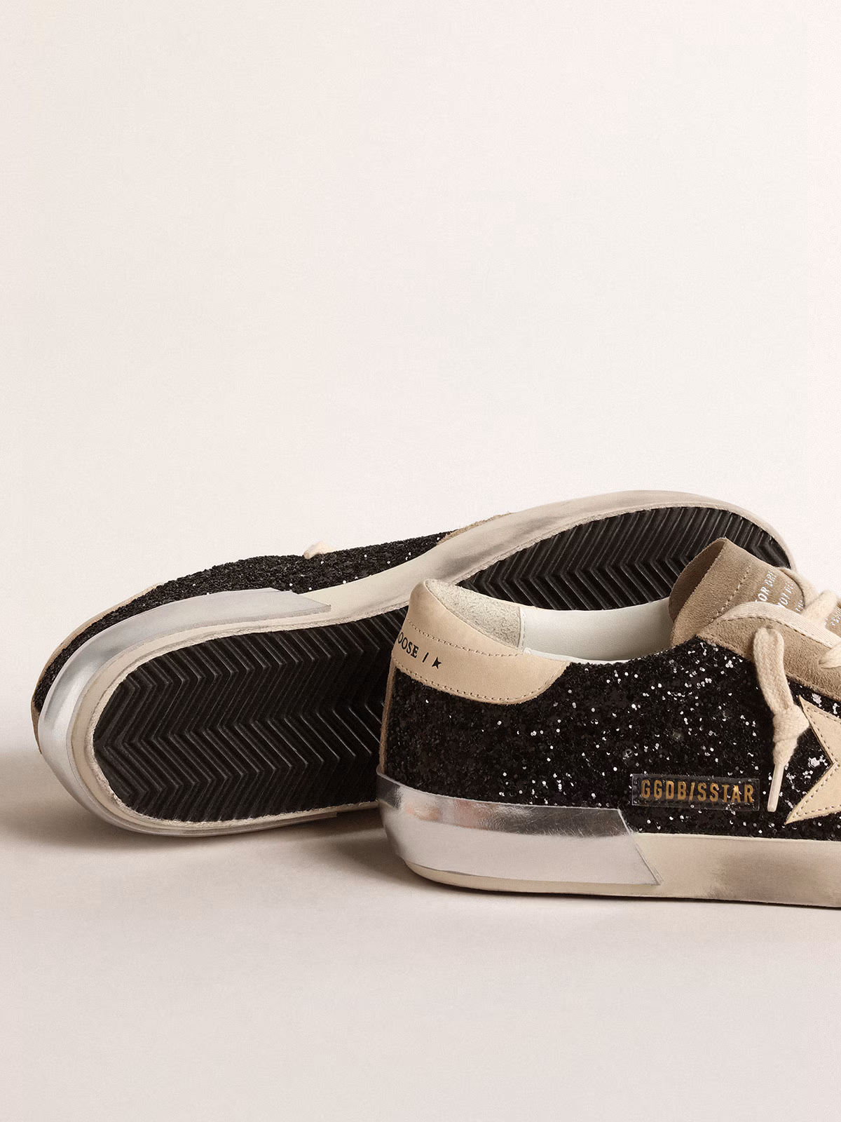 A timeless icon yet one that’s constantly evolving. At Golden, we love taking our classics and reworking them all the time, always from a new angle. These Super-Star with a black glitter upper feature a vintage-effect cream leather star and heel tab. The dove-gray suede inserts, such as the tongue and insert on the back, silver multi-foxing and cream-colored laces add the finishing touch.