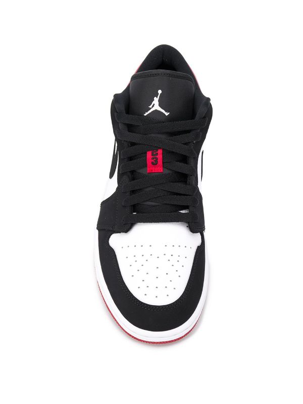 The upper of the Jordan 1 Retro Low showcases a striking blend of premium black and white leathers, accented by a vibrant red heel counter. Classic elements, such as the iconic Swoosh and the timeless ‘Wings’ logo, are in black, tying the whole look together. All this sits atop a clean, white midsole, proving that simplicity can still make a statement.