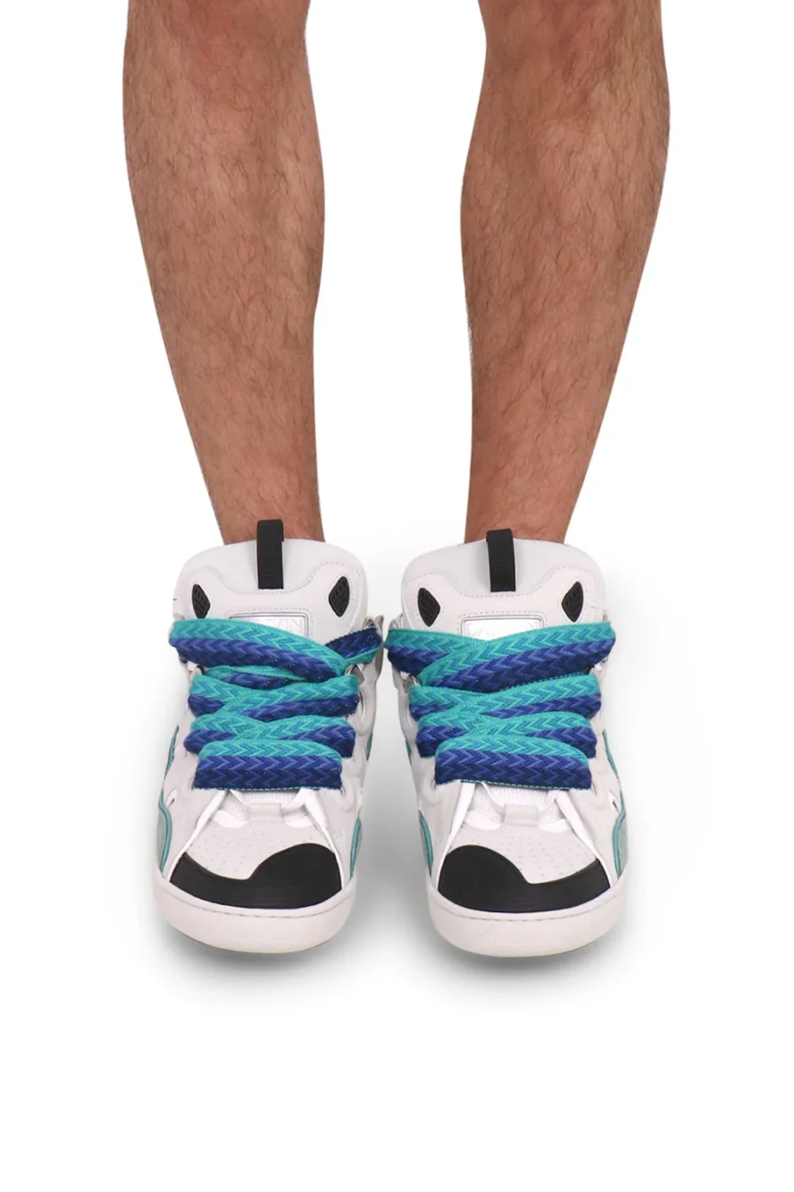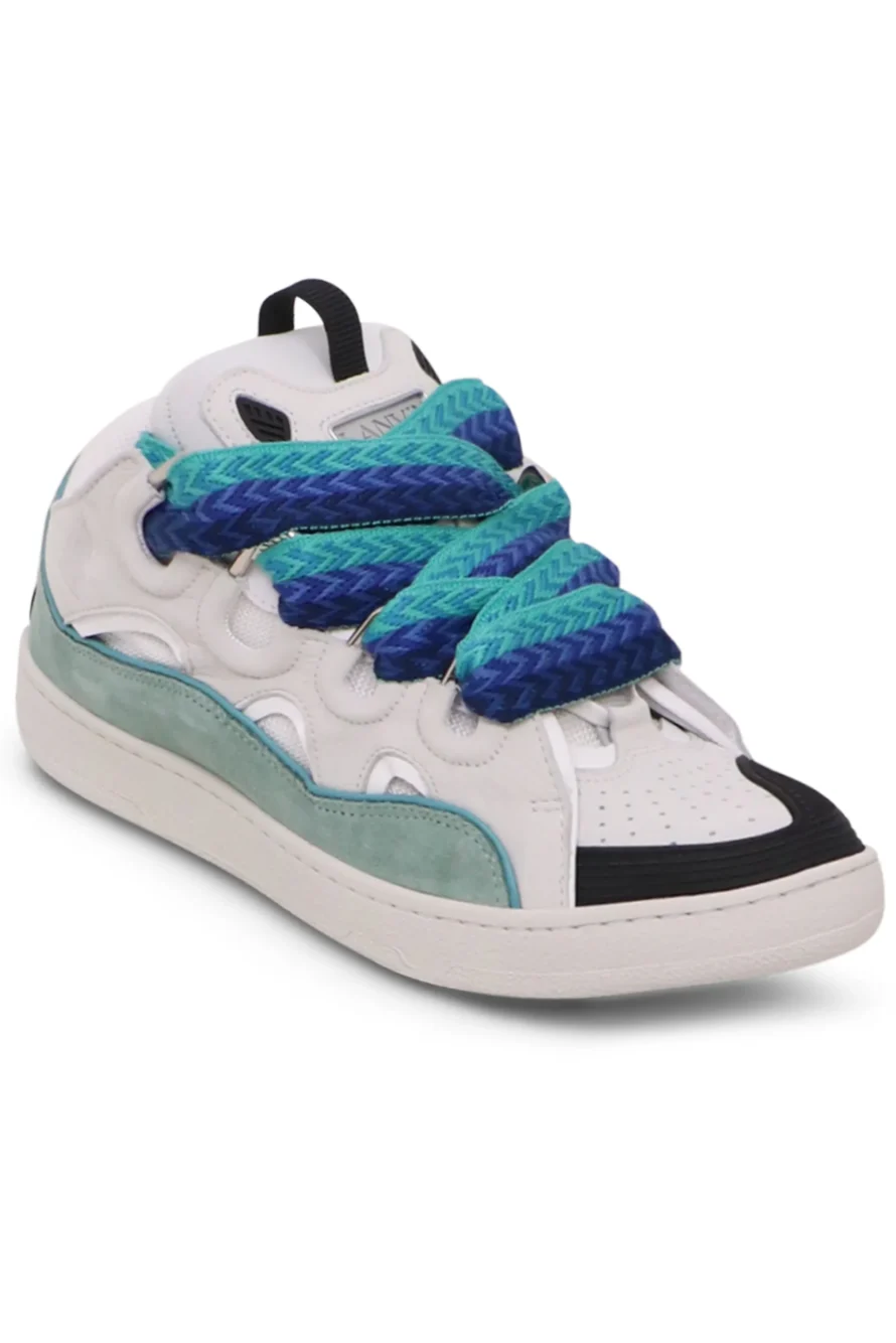 The Lanvin Curb Sneakers are crafted from calfskin leather. This mid top trainer is inspired by the 90s and features exaggerated dimensions, suede, leather and mesh panelling on the upper, padded tongue with Lanvin label, metal eyelets, rounded shape and is double laced, one of the them being wide with a herringbone print.
