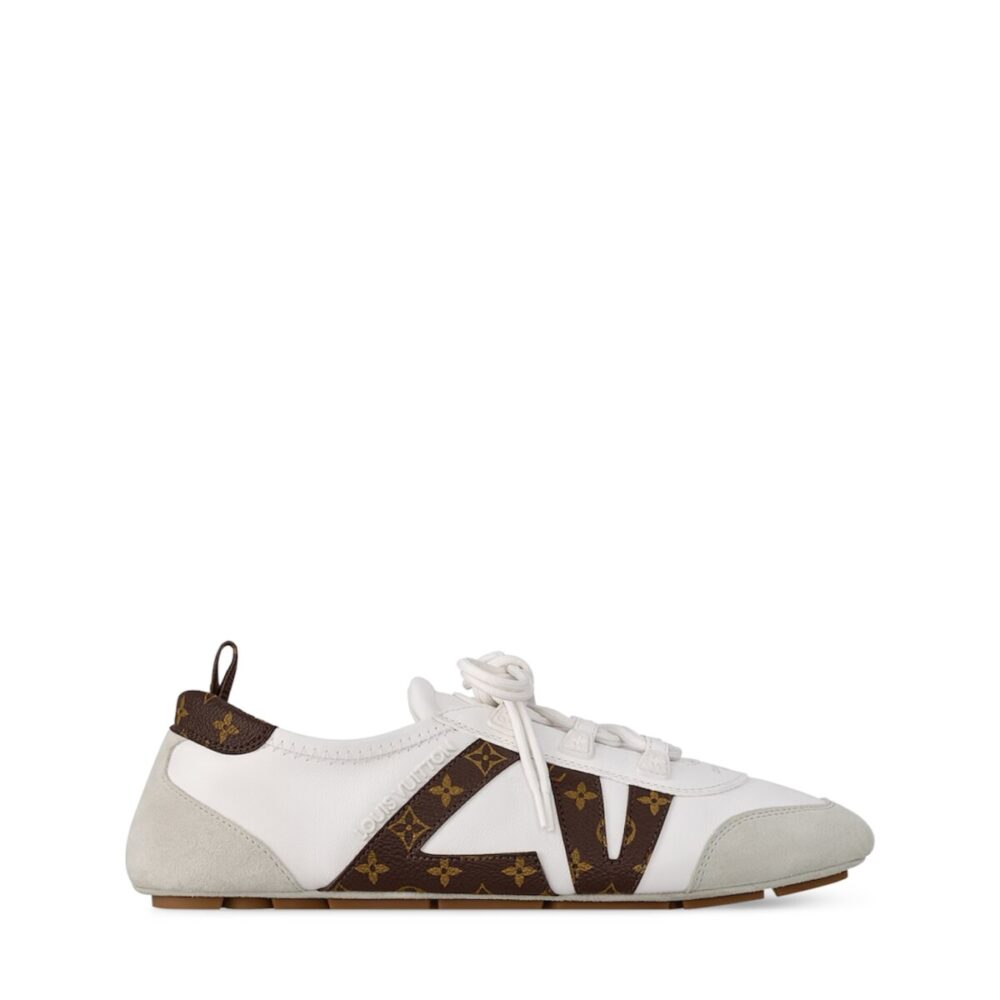 The LV Sneakerina sports shoe, made of soft sheepskin, shows a contemporary style. Its comfortable and lightweight ballerina-type design features calfskin suede trim and a Monogram canvas LV logo on the side. This model, versatile and easy to combine, is completed with a flexible Sacchetto construction and a polyurethane sole.