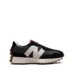 The New Balance 327 Black Moonbeam (W) arrives in a white and black color palette, and a brown rubber sole provides contrast.