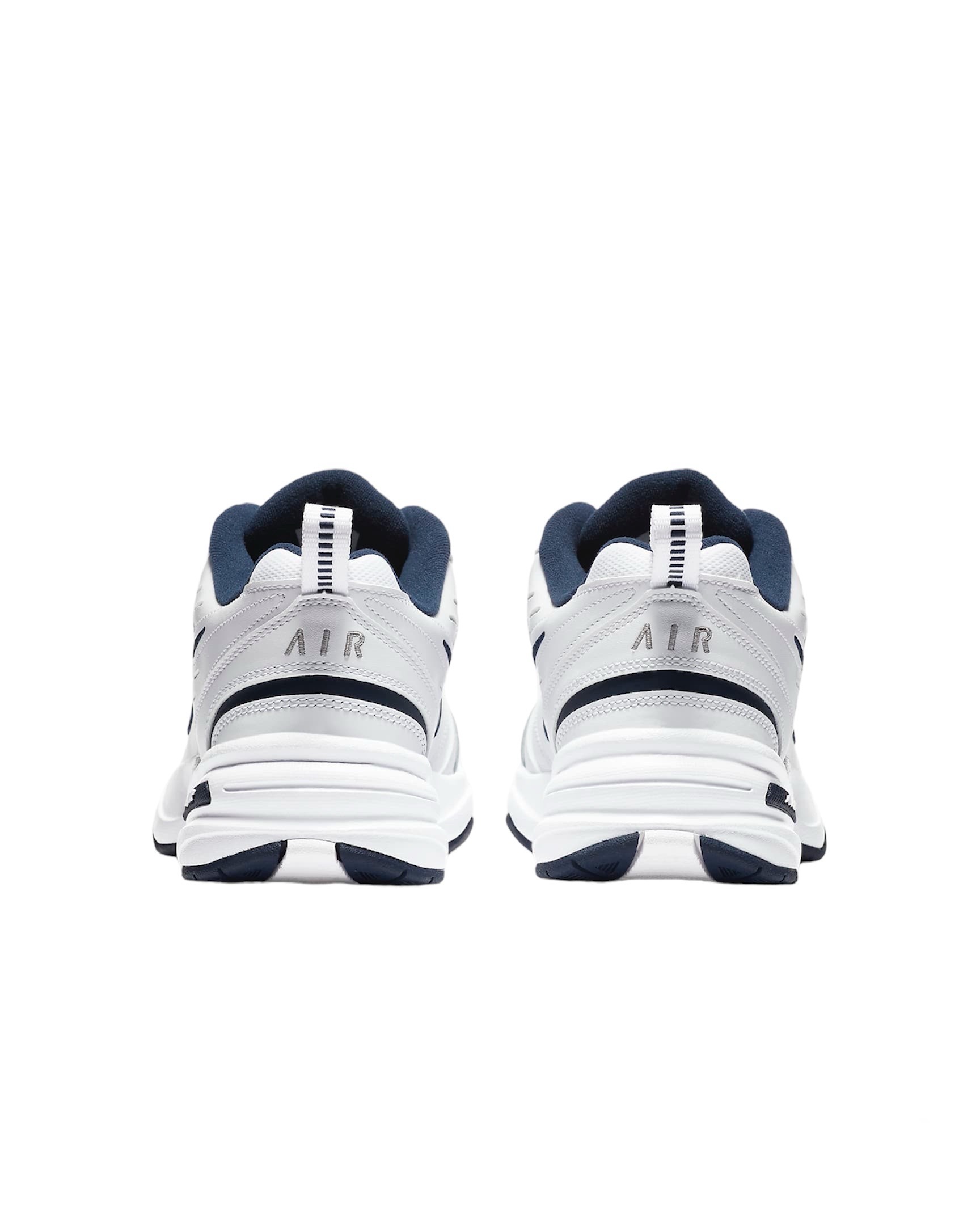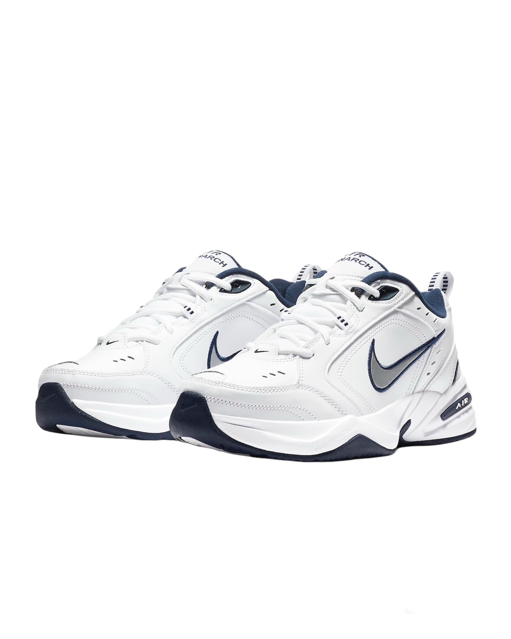 The upper is a mixture of white leather and synthetic material, featuring a metallic silver perforated toecap. The midsole of the Nike Air Monarch IV White Navy is made from all-white foam phylon. The outsole of the shoe, which is made of rubber featuring air encapsulations, completes the design.