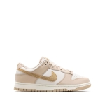 The upper section of this Low Phantom Nike Dunk model features a cream-colored leather base with perforations in the toe box and light grayish-tan leather overlays. The midsole matches the base and the grayish-tan outsole matches the overlays. The color metallic gold appears on the Nike Swoosh as well as the Nike branding on the heel and tongue. The grayish-tan insole features cream-colored Nike branding.