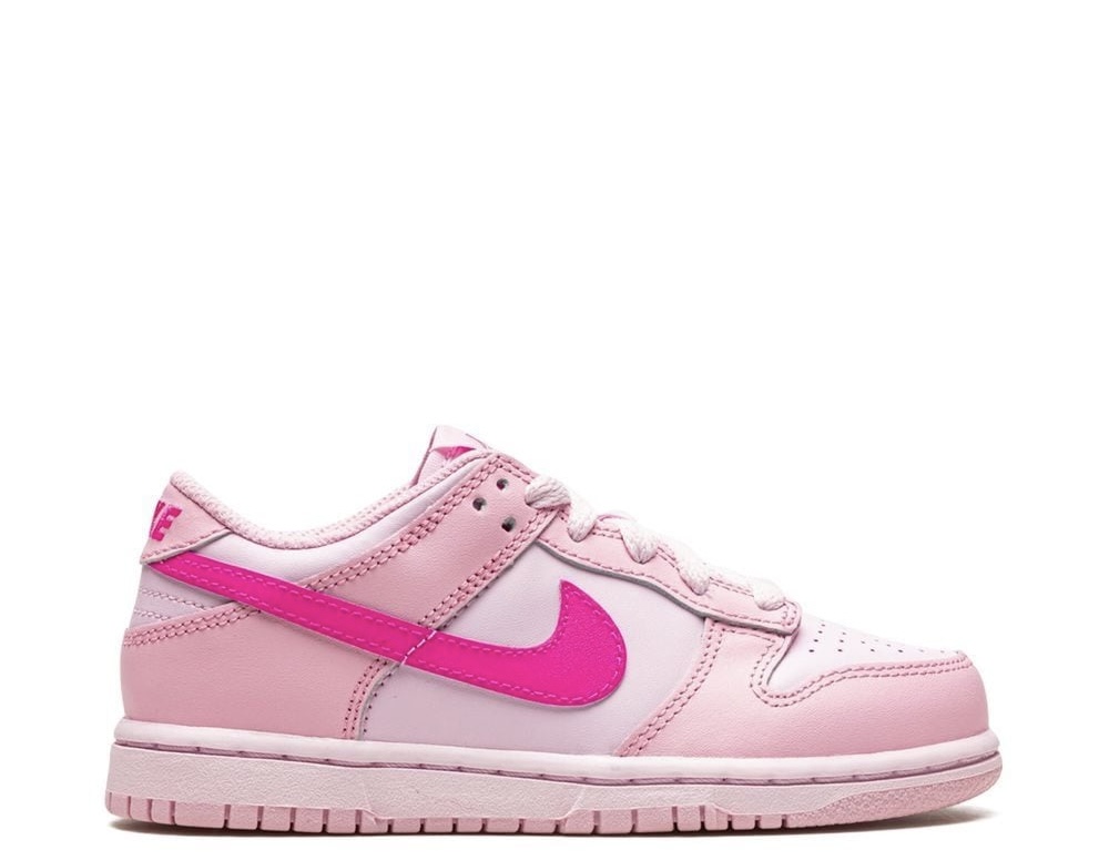 The look is completed by the Nike Swoosh in a bold pink that provides a strong contrast and stands out noticeably on the shoe. In addition to the Swoosh on both sides, the Nike Dunk Low Triple Pink (Grade School) features Nike branding on the sole, heel, tongue, and inner sole. This shoe comes in Grade School (GS) sizing.