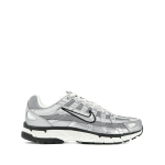 The Metallic Silver Nike P-6000 features an upper base crafted from breathable metallic fabric. Both vertical and horizontal overlays are constructed of chrome synthetic leather course across the upper, making it glisten. A silver side-panel Nike swoosh is outlined in black embroidery that connects with the black foxing and black Nike branding on the tongue tag and heel tab. The white laces match the tongue, sock liner, and insole with P-6000 branding in black. A miniature black Nike swoosh adorns the toe box.