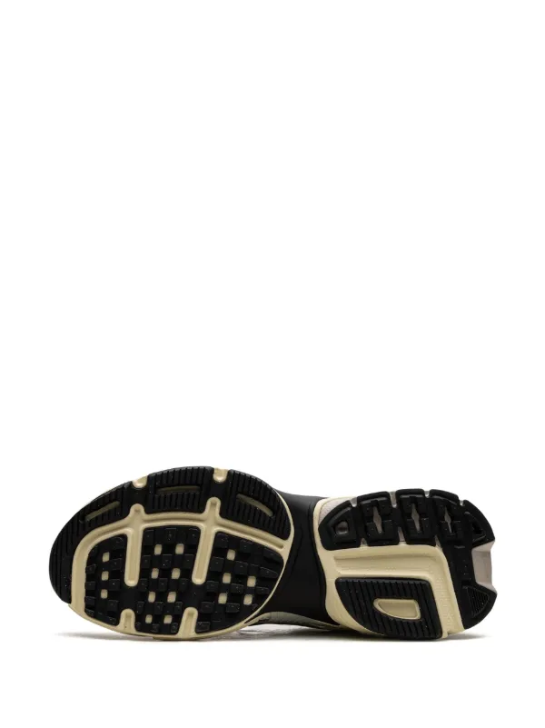 This sneaker features an upper made of a mix of material. White mesh provides the base of the forefoot, while Metallic Silver synthetic leather overlays cross over the top of it. These overlays also appear lining the toe box and under the laces. Clear and white plastic overlays adorn the midsole of this Nike V2K Run, and on top of that a Nike Swoosh appears in gray outlined by black.