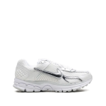 The Nike Zoom Vomero 5 Chrome Toe (Women’s) is a women’s-sized athletic shoe crafted with a mesh upper in White, accented by Metallic Silver at the lace panel, vamp, and the side Swoosh. Linear and mesh caging over the quarter and heel counter heighten the multi-white color palette in Summit White and Pure Platinum, accented by a segmented mid- and outsole in the same color combo. Off-white Swoosh branding on the heel finishes the look.